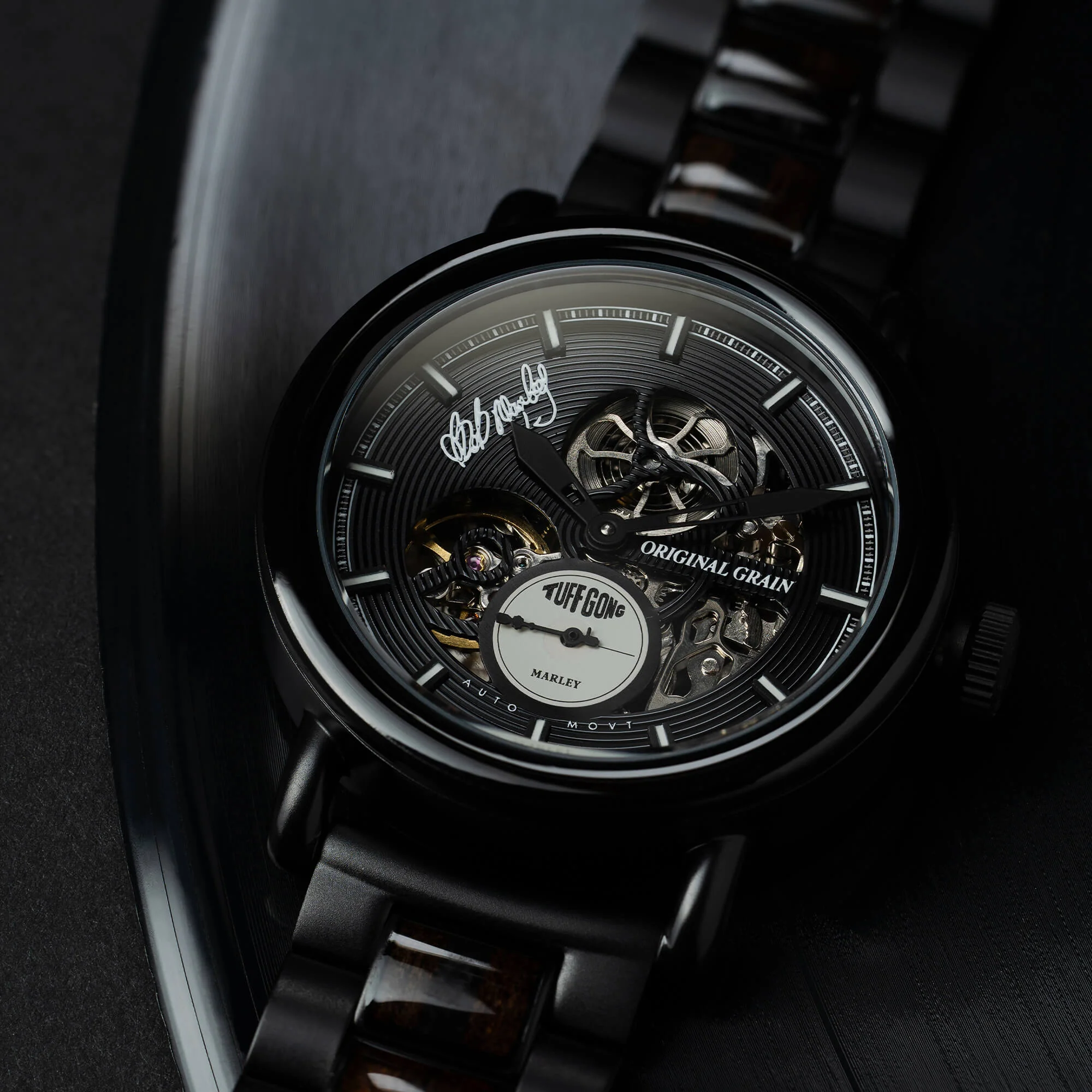 Ebony Tuff Gong Skeleton 40mm featuring a custom vinyl record made at the historic Tuff Gong in Kingston Jamaica.