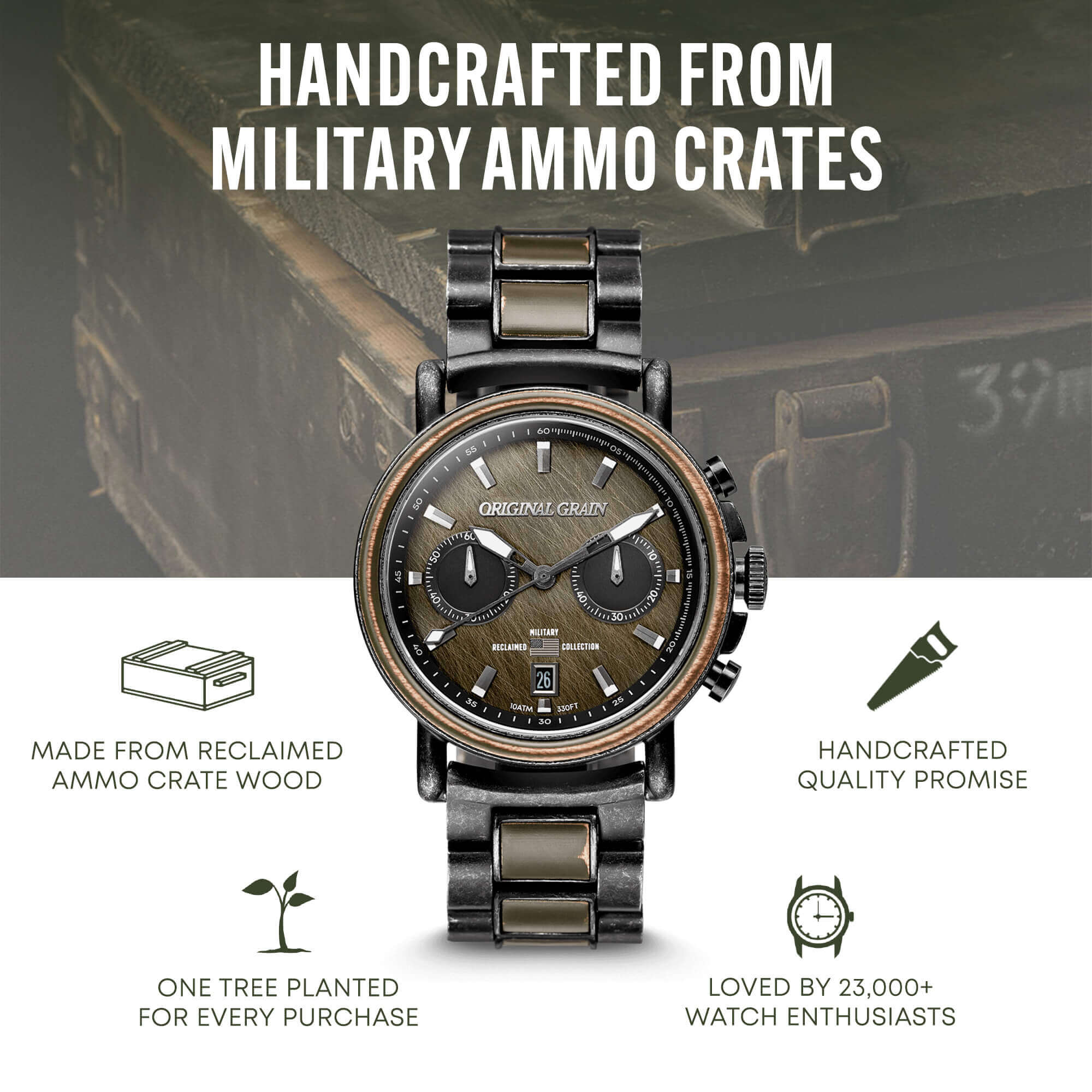 The Military Chronograph is our salute to service, and style. Handcrafted with authentic US military ammo crates, this watch was built for soldiers & veterans, by our veteran-owned company. This collection tells the stories of the brave men & women, and their families, who have sacrificed in service for their country. Join our mission, and salute to service & style today.