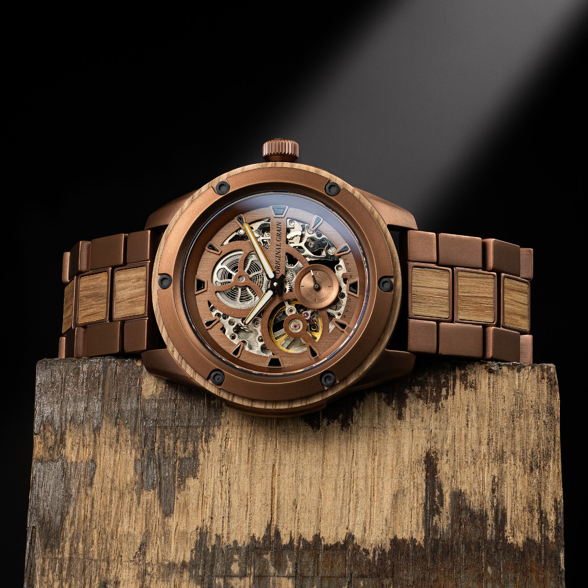 Whiskey Espresso Rugged Automatic 44mm - Featuring a highly accurate automatic movement with a skeleton dial, 40-hour power reserve, and 20 jewels, as well as an ultra-durable sapphire crystal glass cover. Made with a finely brushed espresso plating unique to Original Grain, and reclaimed natural Oak whiskey barrels.